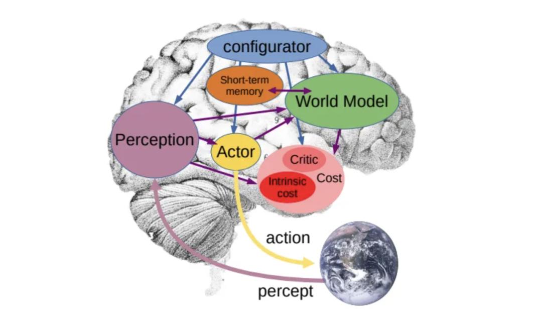 因此,想让 AI 获得如人一般对真实世界学习、应对和规划的能力,他展示了自己在一年前所发表的论文中提出的架构「自主智能」(autonomous intelligence)。这是由一个配置模块控制整个系统,基于输入信息,进行预测、推理、决策的架构。其中的「世界模块」具有估计缺失信息、预测未来外界状态的能力。