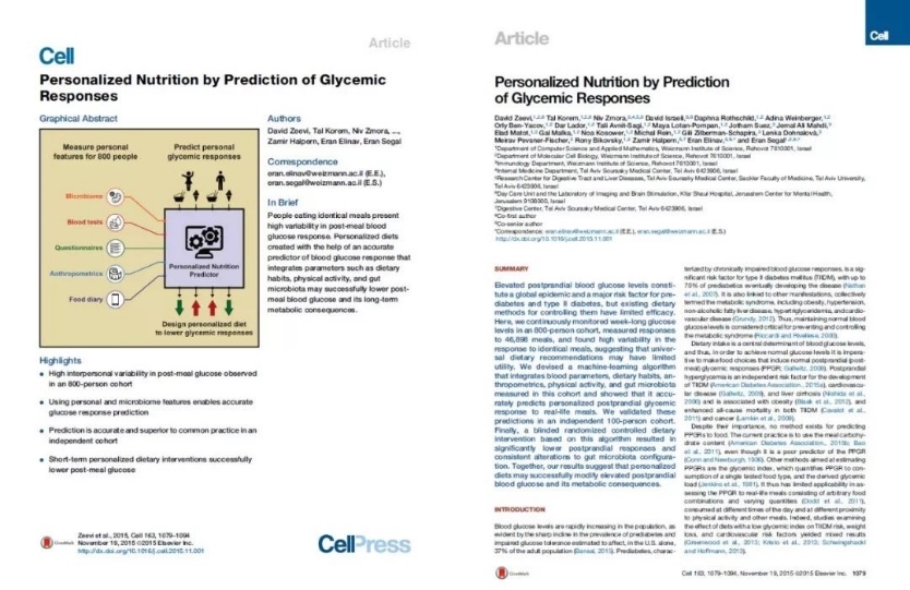 在西格尔教授等科学家的领导下,魏兹曼科学研究所发Personalized Nutrition Project个体化营养计划,这是一项旨在帮助人类做出有益健康、提高生活质量的饮食选择的大规模营养科学研究,也是世界上第一个将广泛的信息收集,与精准预测算法相结合的个体化营养科学研究。西格尔教授利用自主开发的机器学习算法,将肠道菌群、血液检测指标、健康问卷、身体测量指标以及食物日志等数据相结合,准确预测志愿者的血糖水平,并提供个体化营养的指导,其中肠道菌群数据的指导意义尤为强大。计划取得了巨大成功,研究成果发表在Cell杂志上。