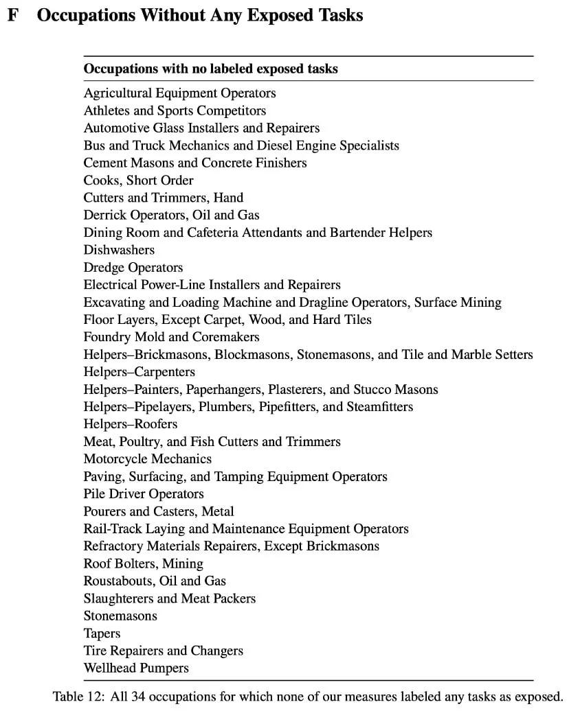 耐人寻味的是,这些不受到 AI 影响的职业群体中,无一不是涉及动手的蓝领工作者,其中包括木匠、管道工、厨师、装修工人等。