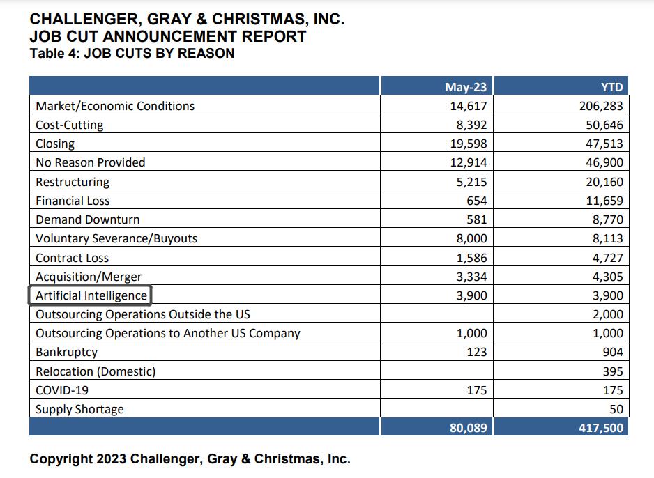 整个 5 月,AI 造成了 3900 名员工失业,约占被裁者总数的 5% 。
