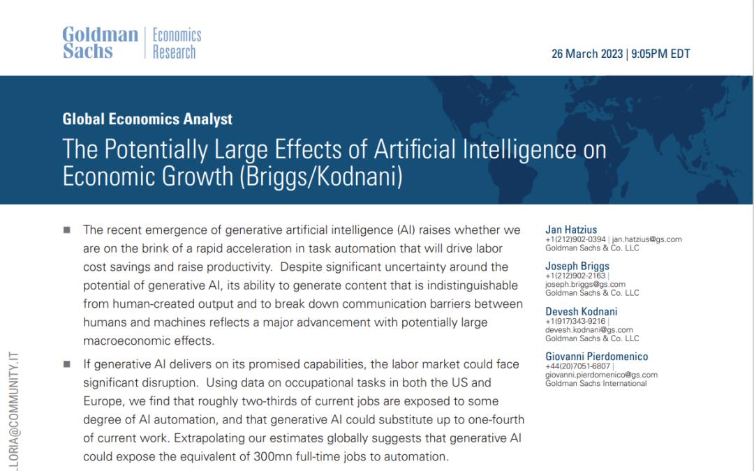 与此同时,在 3 月 26 日 Goldman Sachs (高盛)发布的报告中,也阐述了 AI 将给就业市场带来的影响:可能会使 3 亿份全职工作面临自动化。此外,高盛还预估未来大约 2/3 的美国职业在一定程度上受到 AI 自动化影响。