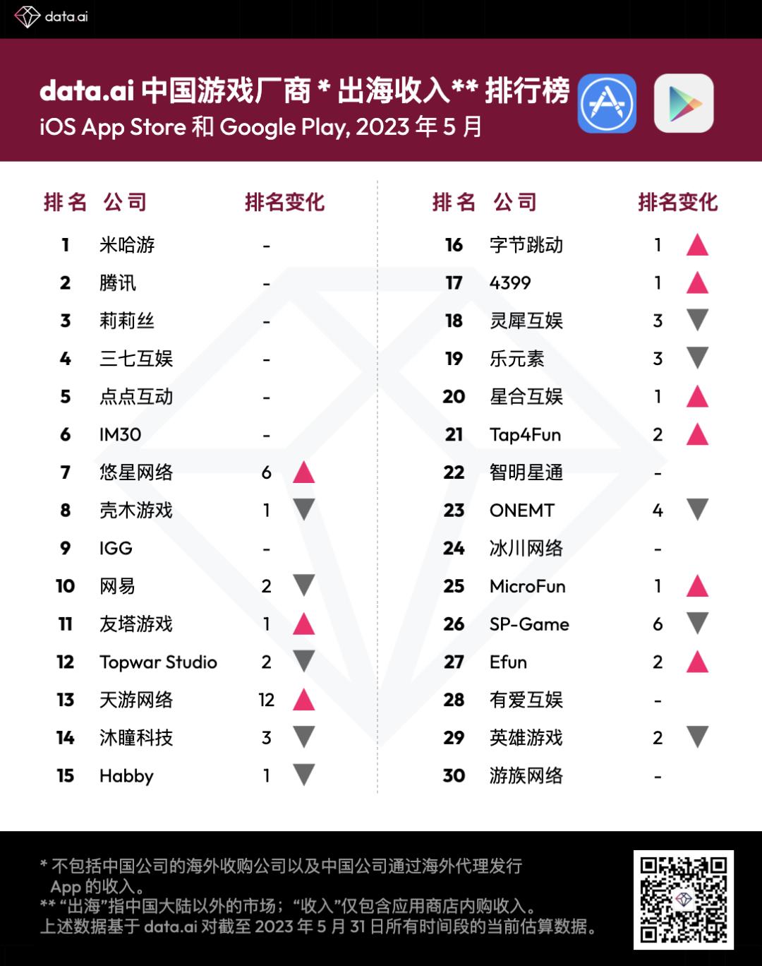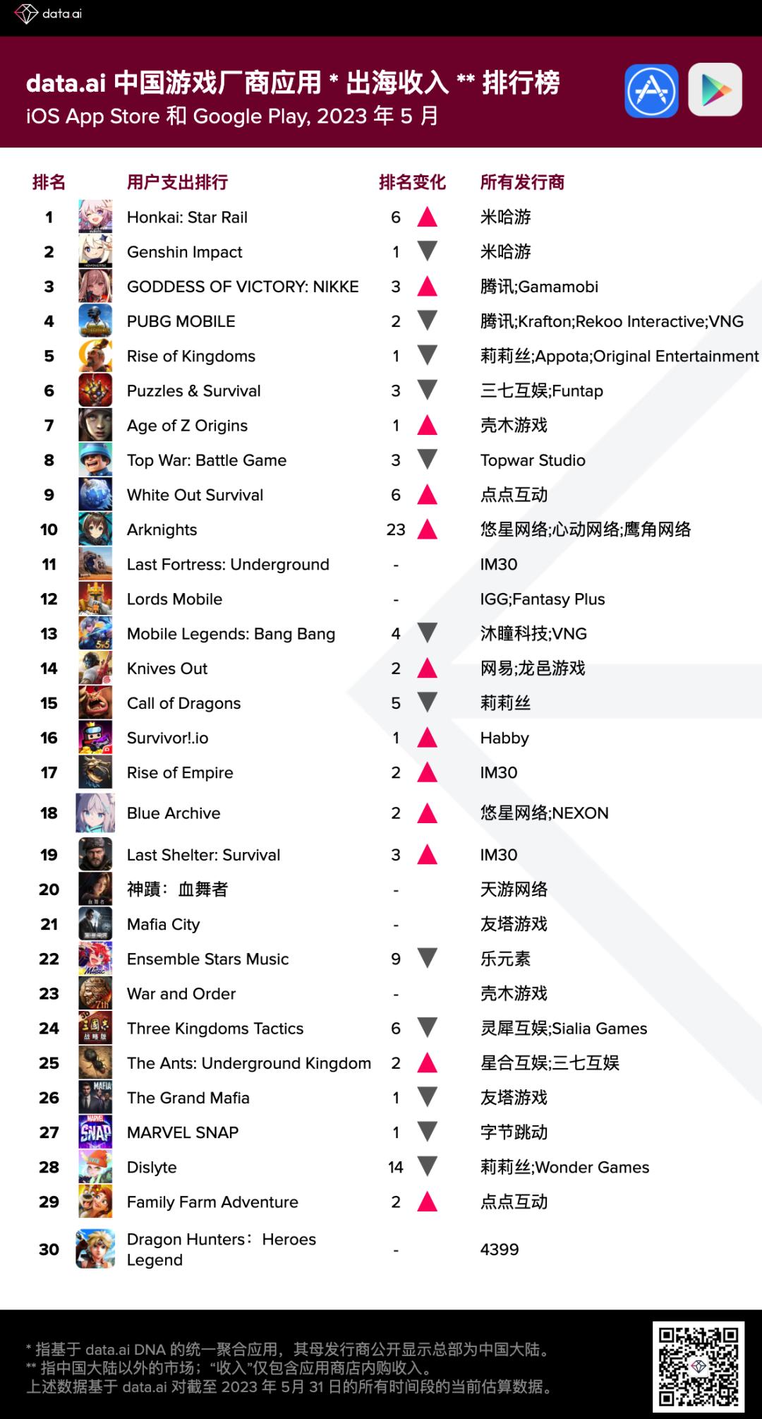 5月份中国游戏厂商及应用出海收入排行榜出炉,厂商收入榜单【前六名毫无变化】—— 按排名先后顺序分别是:第一米哈游、第二腾讯、第三莉莉丝、第四三七互娱、第五点点互动和第六名IM30。