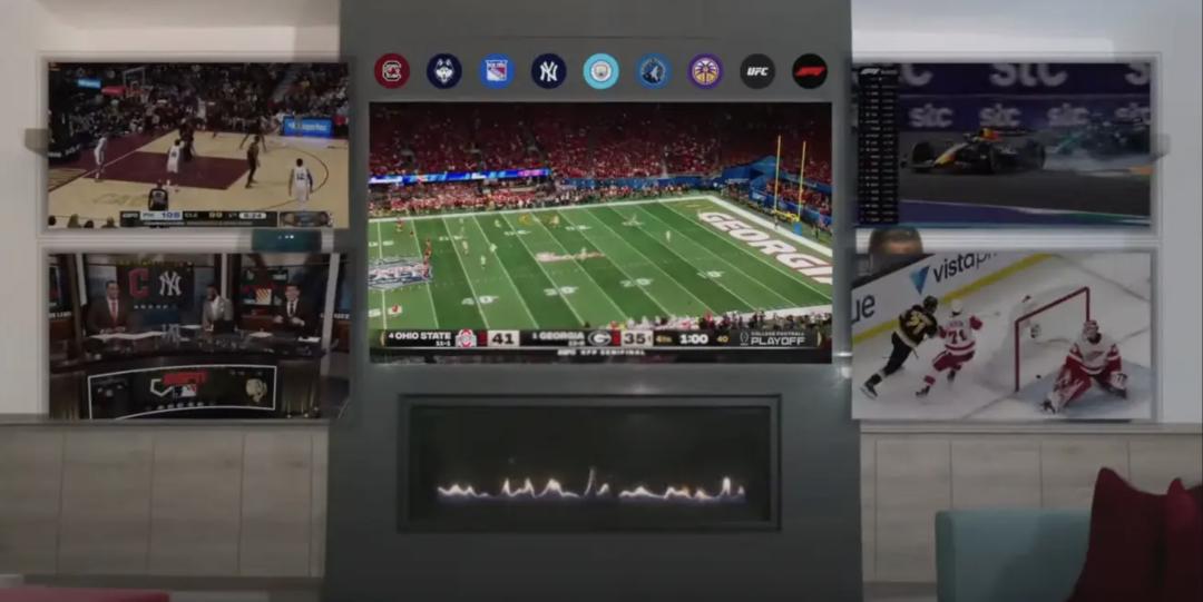 在演示与迪士尼的内容合作时,苹果官方的演示视频中展示了用户可以在虚拟场景下同时观看多场体育比赛,通过多角度、高清晰的视频看到进球的慢动作回放,此外实时统计的比赛数据也将在视觉场景中显示。苹果用 “增强现实” (augmented reality) 一词来描述该设备的功能。视频画外音补充道:“你不仅可以观看体育赛事,还可以足不出户就身临现场,或者以从未有过的方式,成为比赛的一部分。”