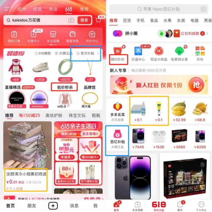 最近一年,抖音曾对货架电商做出过探索,依赖用户的主动搜索,即“人找货”。现在打开抖音主页的商城频道可以发现,商城与传统货架电商已经别无二致。而首页信息重点突出的“低价秒杀”、“0.01元券后”、“官方补贴”,也不禁让人怀疑,这真的不是拼多多吗?