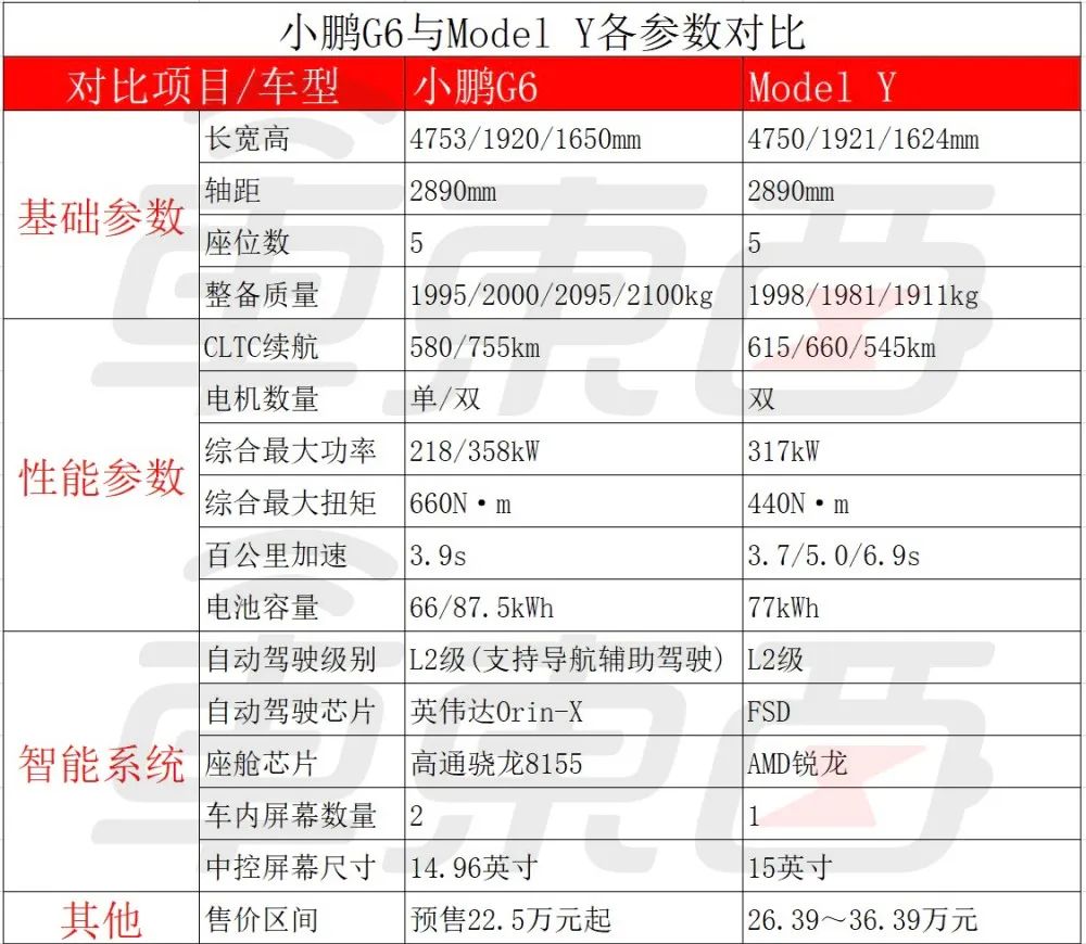 ▲小鹏G6与特斯拉Model Y各参数对比