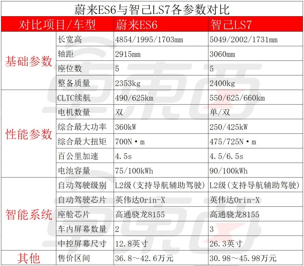 ▲蔚来ES6与智己LS7各参数对比