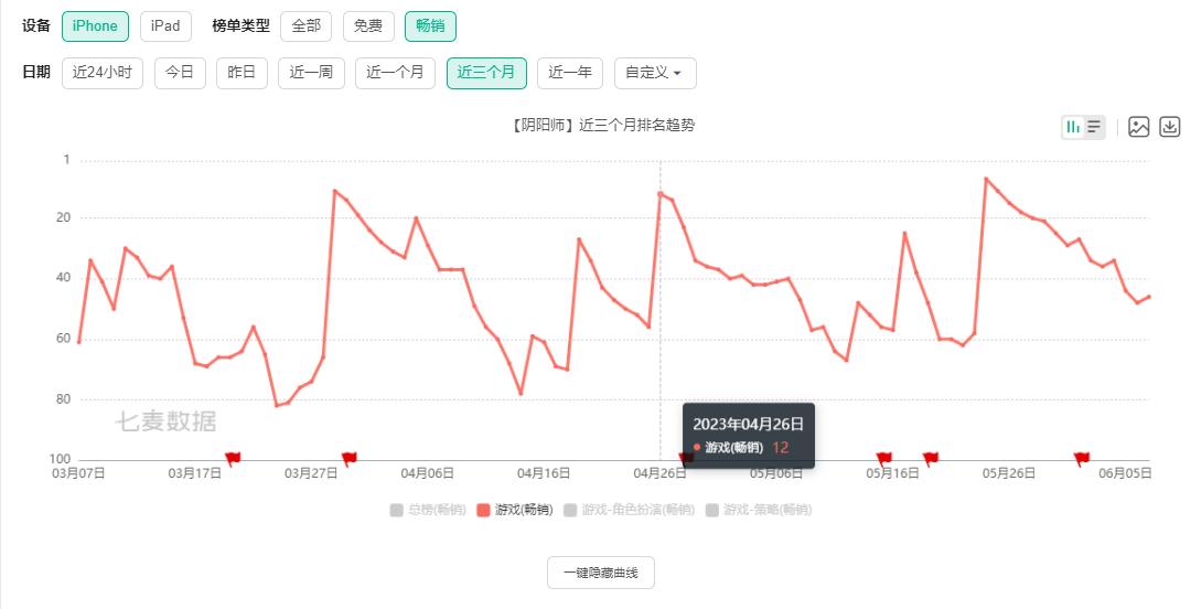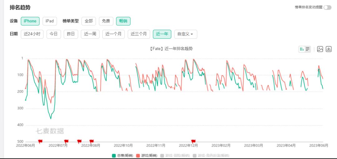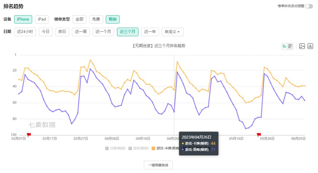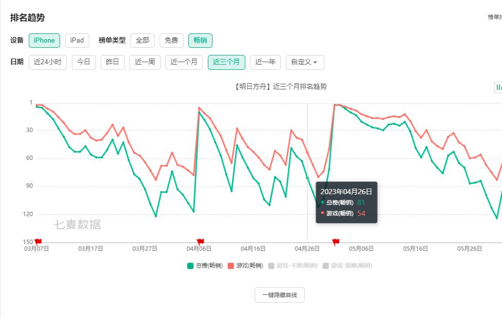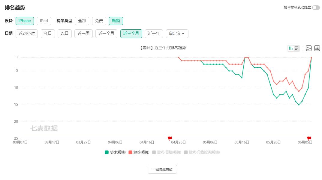 七麦数据上,也可以看出5月17日/6月7日,角色「景元」和「银狼」的UP卡池上线让《崩坏:星穹铁道》在iOS畅销总榜/游戏畅销榜成为榜首。