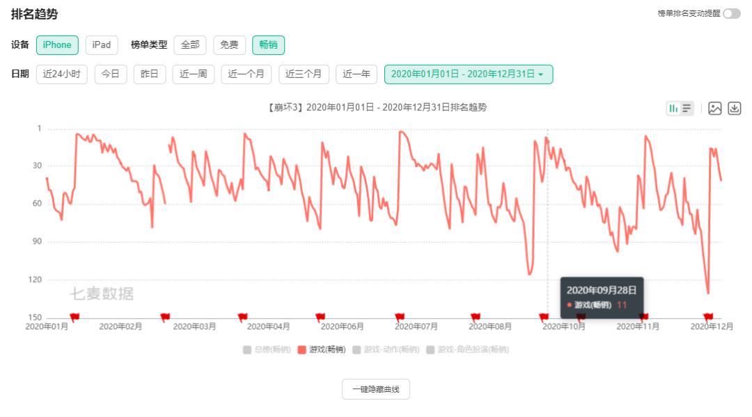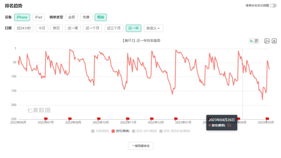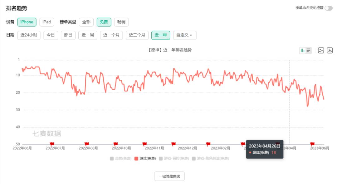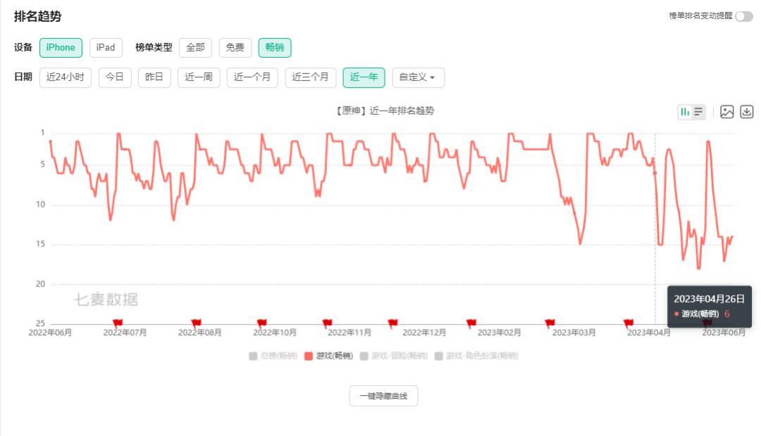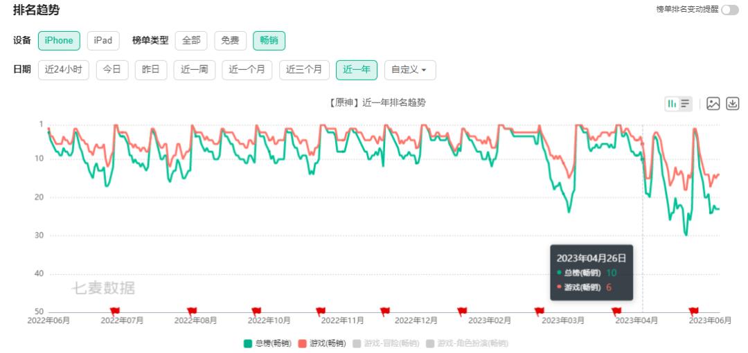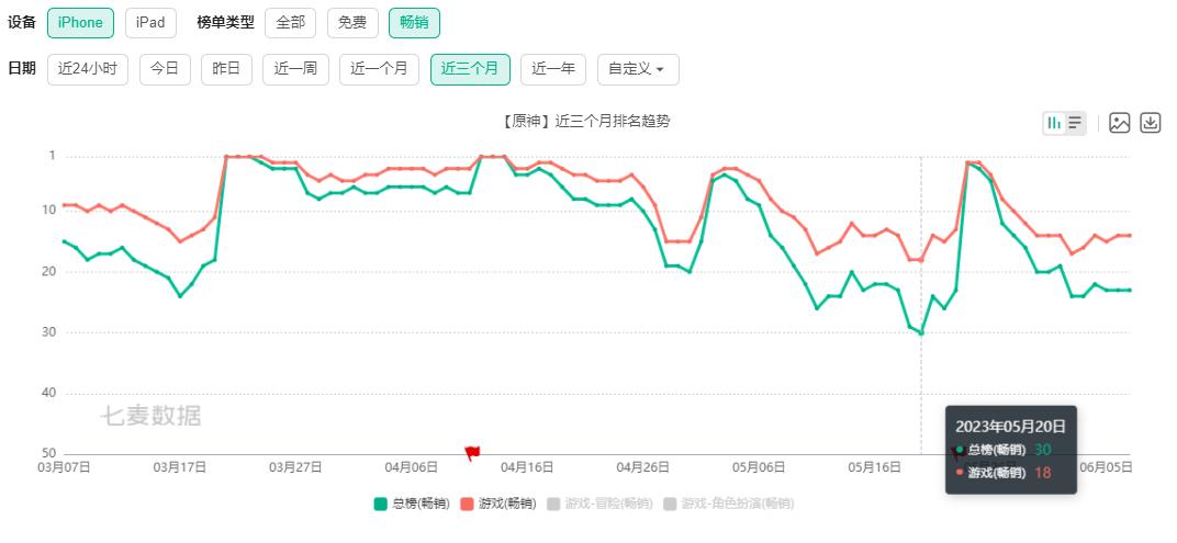 《原神》的免费榜走势,近一年非常稳定,一直保持在5-20的区间内。在《崩坏:星穹铁道》上线前,《原神》的iOS游戏下载榜排名最低也不过是22名,畅销榜成绩此前也会随新版本上线稳定回升。