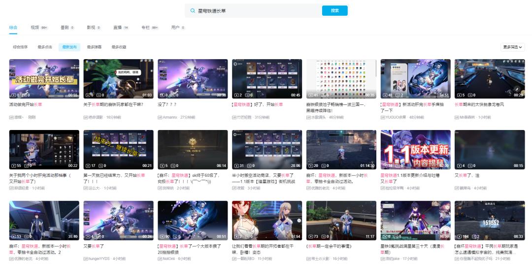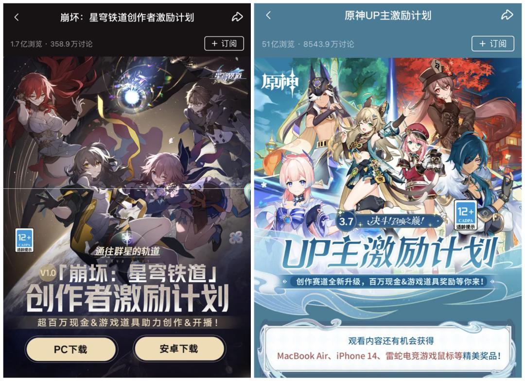 而且,《原神》上线初期的各种角色厨视频热度高居不下,《崩坏:星穹铁道》上线至今角色厨力的视频要比《原神》小很多,比如在B站的创作者激励计划里,6月5日原神3.7版本的浏览量和讨论数要远远超过《崩坏:星穹铁道》,而这还是在大量二创作者被《崩坏:星穹铁道》邀请的情况下。