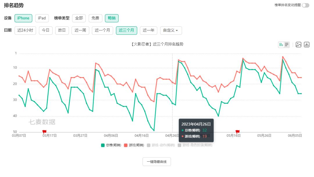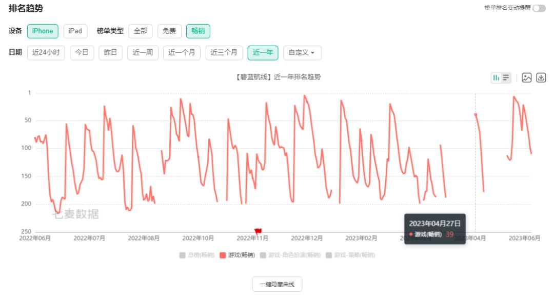 其他游戏如《碧蓝航线》《火影忍者》《无期迷途》《明日方舟》中,《火影忍者》畅销榜上升了,《碧蓝航线》在6月初因为6周年畅销榜冲到了高位,《明日方舟》因为4周年收入大增,甚至一度超过了《崩坏:星穹铁道》,近期收入有所下滑,但也跟《崩坏:星穹铁道》的卡池时间没有直接关系。而《无期迷途》的波动则处于正常范围。