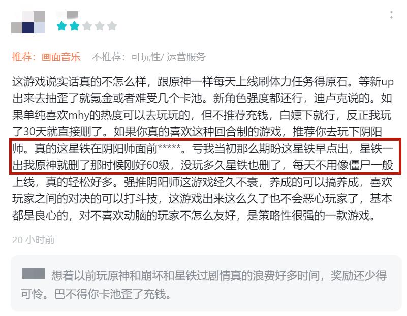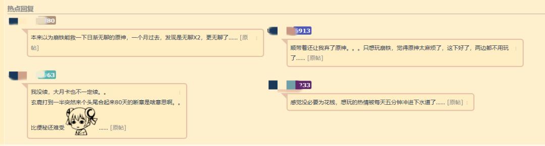 这样的“吸血”还不只在收入方面。在社交论坛上,从“好几天没回《原神》了”,到“干脆两个都卸载了”的言论并不少见。这些玩家先是因为《崩坏:星穹铁道》自动战斗和副游体量玩法更轻度,所以停掉了《原神》。