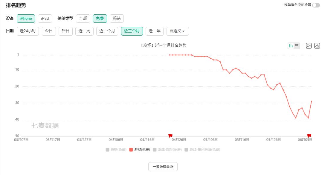 还需要补充的是,《崩坏:星穹铁道》不仅仅是“吸血”《原神》,同期《崩坏3》的iOS游戏畅销成绩下滑到近一年最低点。