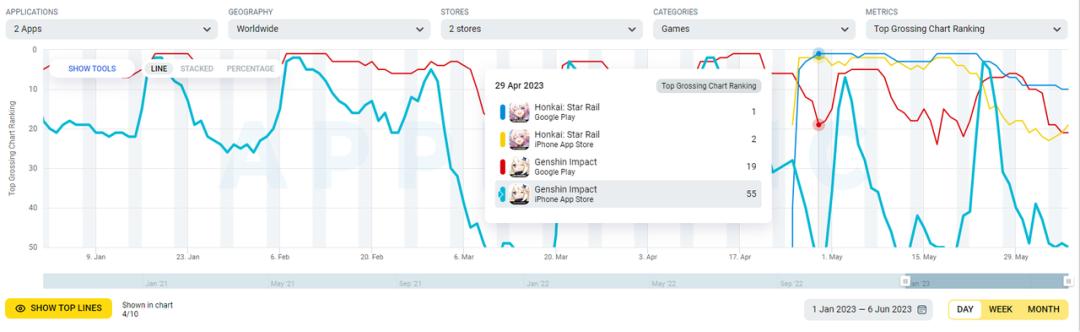最终,《崩坏:星穹铁道》也获得了几次游戏畅销榜第一的成绩。据AppMagic平台数据显示,截至5月26日,该游戏(仅移动版本)的IAP收入(扣除平台费用和含税,不含第三方安卓商店数据)达到1.32 亿美元,《原神》在上线首月的IAP收入为1.72亿美元。