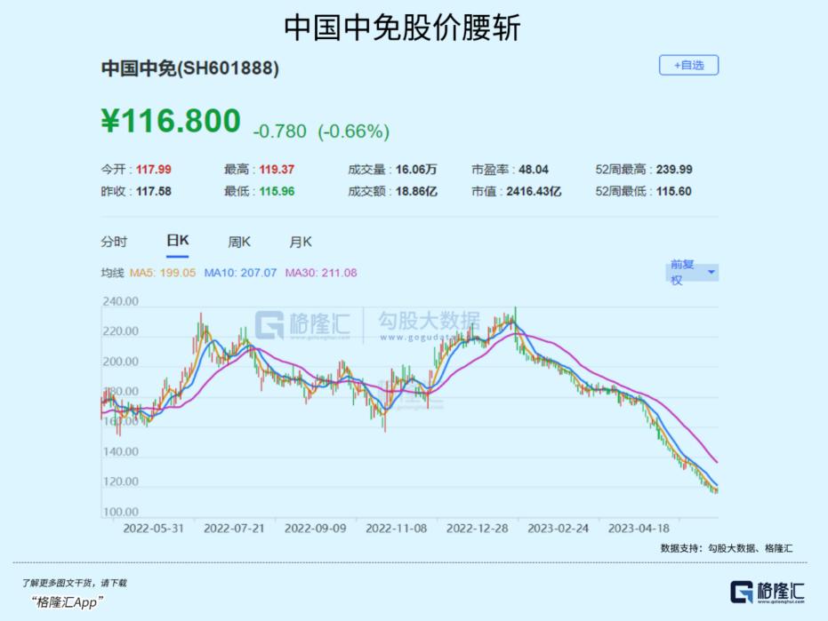 从1月底的位置跌下来,至今已经腰斩。更重要的是,中免的股价已经远低于去年的几个低位,包括4月份、10月份,回到2020年的6月份的位置。