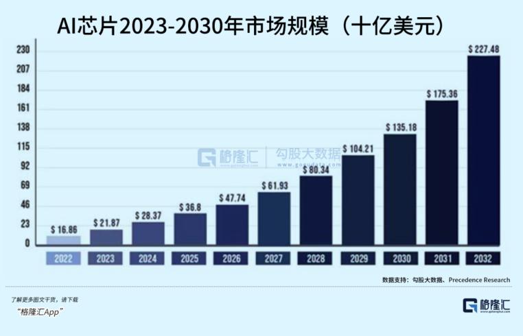 根据Precedence Research,2022年全球AI芯片市场规模为168.6亿美元,将以每年约30%的速度增长,预计到2032年达到约2274.8亿美元。