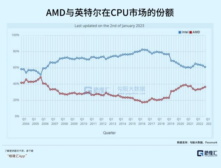 这让人联想到上世纪九十年代的“WINTEL”联盟,互相成就了微软在PC操作系统,以及英特尔在CPU的地位。此时的AMD,已经成为了英特尔市场份额最强有力的威胁。