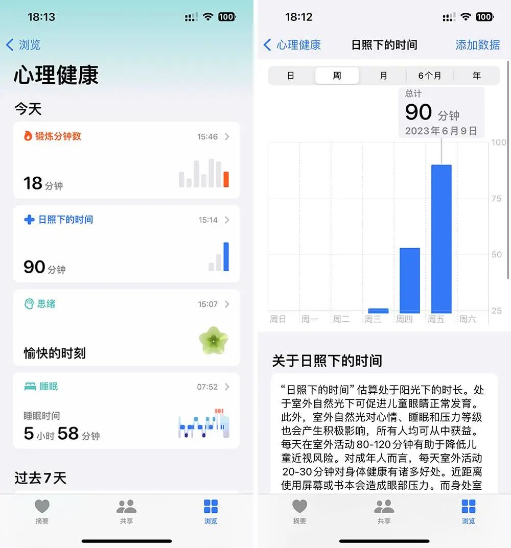 虽然苹果没有明说,但大概是利用了环境光传感器来判断你是否在户外。在健康 app 中我们可以看到苹果的解释:室外自然光对睡眠、心情和压力等级都会产生积极影响,每天要保持 20~30 分钟的室外运动对身体健康有诸多好处。