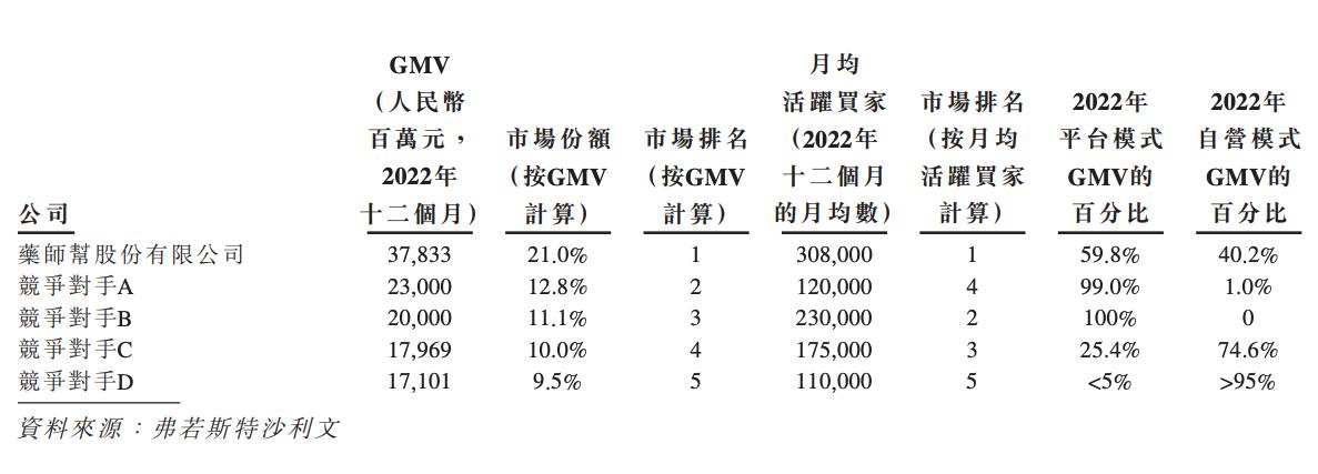 而从行业视角来说,第三方医药电商B2B平台其实普遍处于烧钱亏损状态。以已经于2018年在纳斯达克上市的1药网为例,其在2017年转型医药B2B后,也同样面临亏损问题。财报数据显示,2020-2022年,1药网亏损额分别为4.67亿元、6.21亿元、3.76亿元,且根据沙利文报告数据,其2022年按平台GMV计的市场份额仅为10%,不足药师帮的一半。