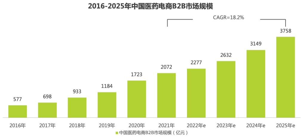 三类B2B阵营共同开拓,推动着中国医药流通持续线上化转型。艾瑞咨询数据显示,2016-2022年,医药电商B2B经历了一波快速发展期,交易规模由577亿元增长至2277亿元。