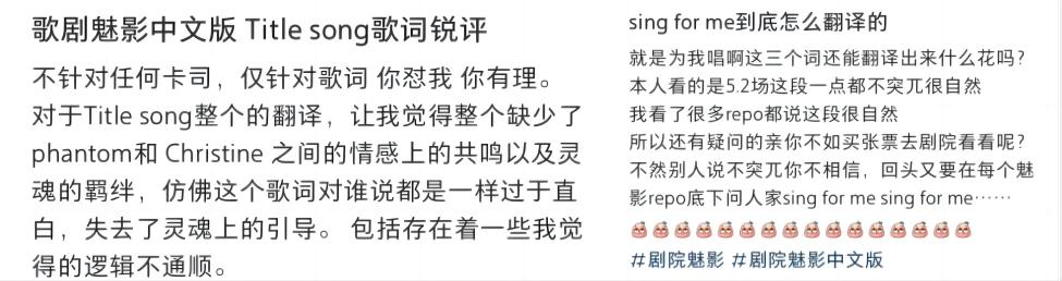 (小红书上对《剧院魅影》中文版翻译的评价)