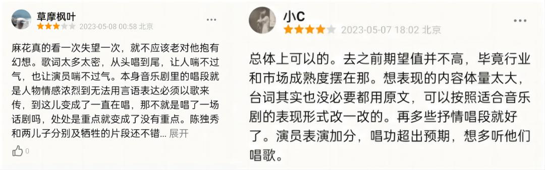 如《觉醒年代》,便被观众吐槽“歌词太密了”“大歌太多了”“太流水账了”。