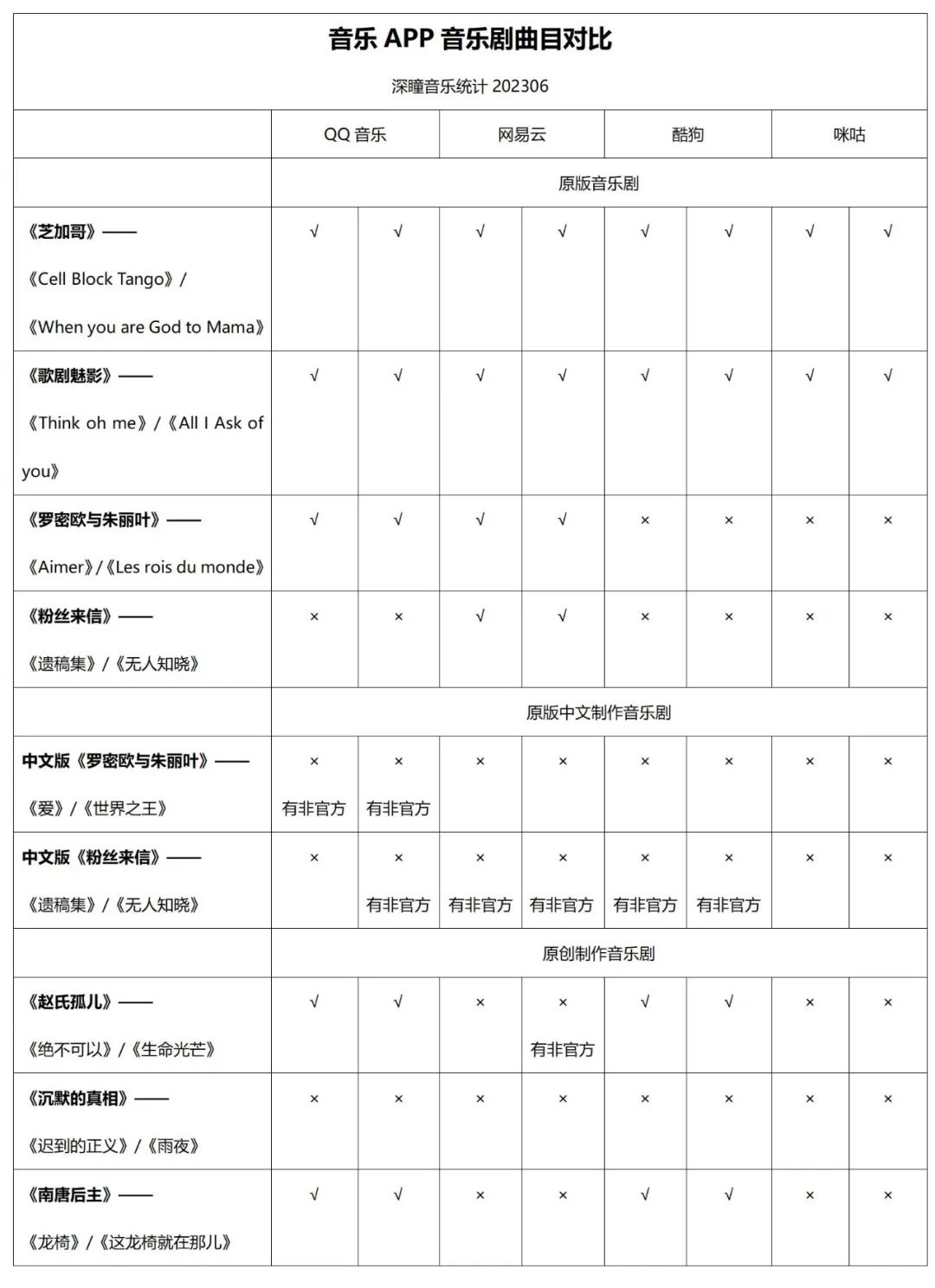 对比线上曲库,我们会发现,外国原版音乐剧普遍资源较全,但是中文版制作音乐剧,以及国产原创音乐剧,曲目则缺失严重。