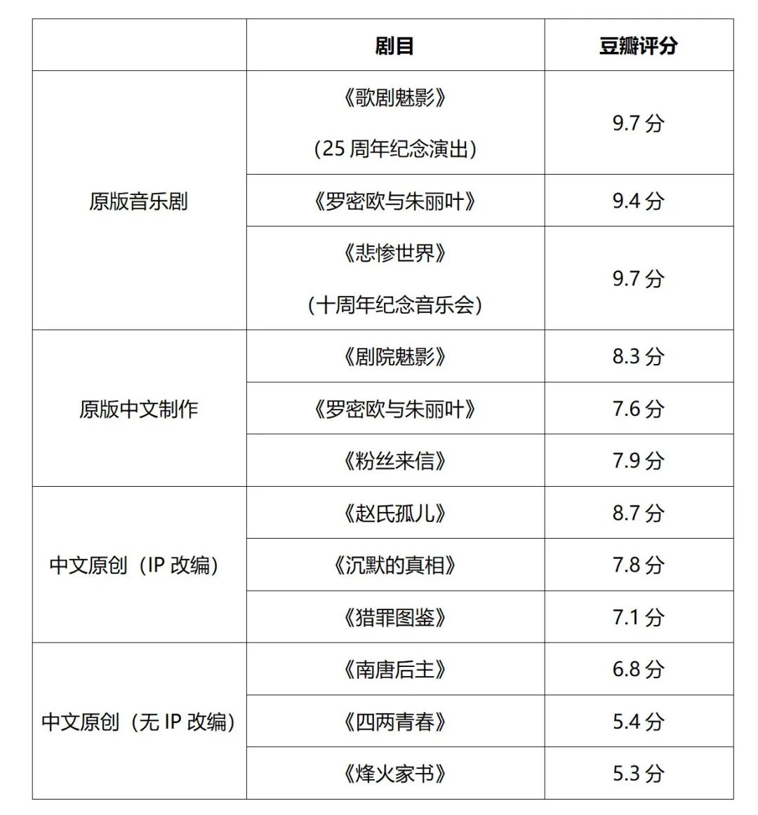 对比豆瓣上的音乐剧评分,我们会发现明显断层。原版音乐剧高于中文版制作;而在原创音乐剧中,改编自IP的音乐剧又明显高于无IP改编的音乐剧。