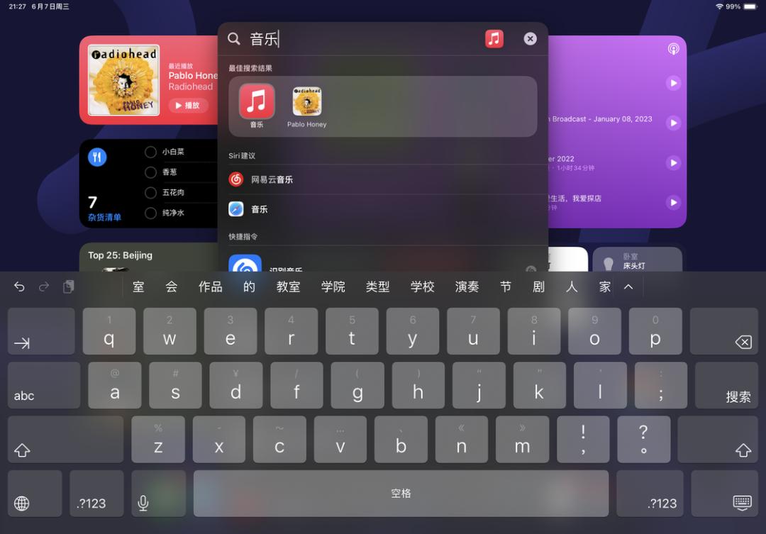 如果你在 iPad 上使用外置键盘输入,在 iPadOS 17 中,输入法候选项高亮颜色是根据当前窗格的颜色自动提取的 —— 这有点像 macOS。此外,每次新进入一个文本框,或者是使用 CapsLock 键快速切换输入法的时候,iPadOS 17 会更加微妙地指示当前的输入法。