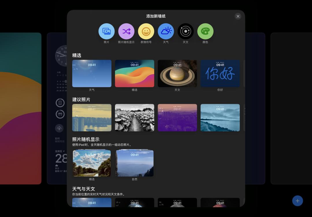 与 iOS 16 相对一致,iPadOS 17 中,我们也可以通过长按锁定屏幕来开始对锁定屏幕进行自定义,并将它们与特定的专注模式相关联。除了 iOS 16 中的效果外,iPadOS 17 还提供了「万花筒」「你好」这两个新的锁定屏幕模式;同时,也增加了「团结」锁屏的配色,以及「天文」锁屏可以观察的星球。