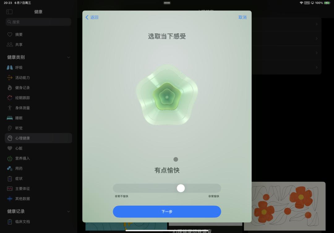 此外,「心理健康」也随着 iPadOS 17 和 iPad 版「健康」app 来到了 iPad 上。在这个区域,我们可以记录自己当前或者整天的情绪感受(系统内置了相当多的词语来描述情绪),并且可以记录对自己的情绪影响最大的生活事务。通过长期记录,我们可以跟踪个人的情绪感受,并且在意识到问题的时候及时寻求帮助。这里还有不少与心理健康相关的文章可以阅读,并且可以使用心理健康问卷调查。