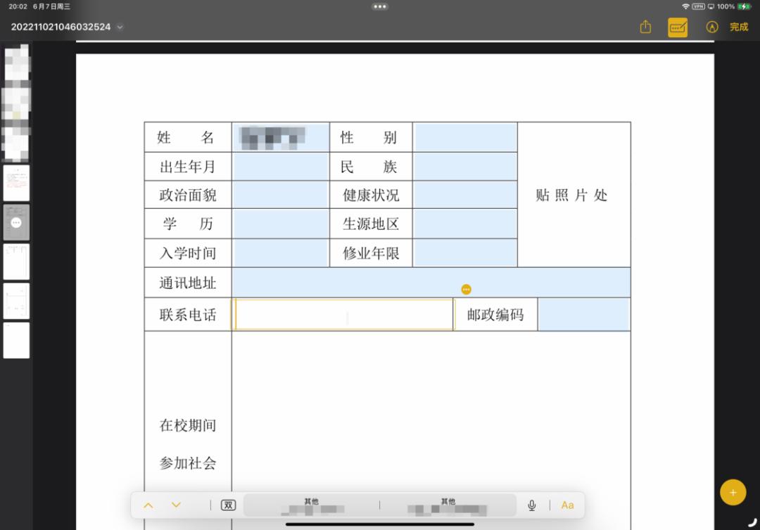 在 PDF 标注方面,iPadOS 17 还带来了自动表单识别功能。这项功能可以识别 PDF 页面中的表格、需要填写的空白等,并且根据表格问题来给出一定的建议,例如姓名、地址、电话等。这项识别完全自动进行,只需要点击工具栏中「表单填写」这个按钮就可以。对于没有自动识别的表格项,也可以点击页面右下角的「+」号来手动添加。这项功能也适用于在 iPadOS 17 系统内各处通过「快速预览」打开的 PDF 文件,例如「备忘录」「文件」等。