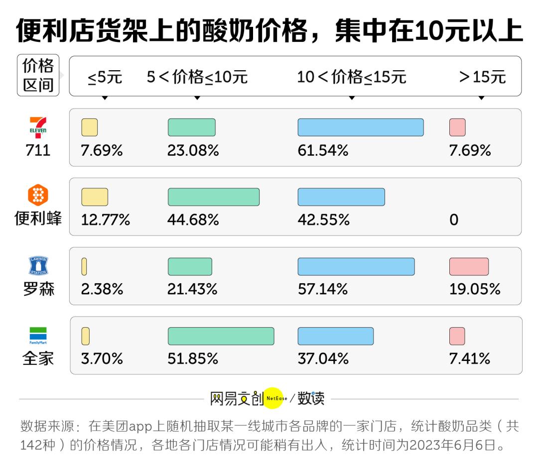 我们在外卖软件上统计了几家便利店共 142 种酸奶产品的价格,随机抽样的便利店销售的大部分酸奶价格集中在 10 元以上,小于 5 元的酸奶占比几乎在 10% 以下,而像罗森则有四分之三的酸奶超过 10 元。