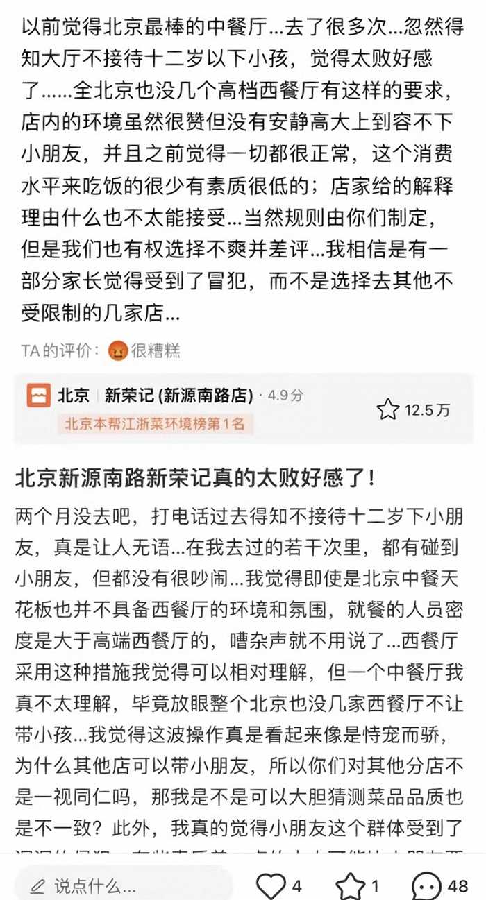 事件起因为,一位网友在社交平台发布了一篇名为“北京新源南路新荣记太败好感”的帖子,表示预订上述新荣记门店时被电话告知门店不接待12岁以下小朋友,认为家长受到冒犯并侵犯了儿童群体权益。