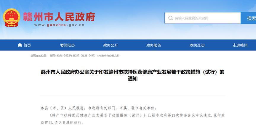对于医药产业建设,2022年4月出台了《赣州市扶持医药健康产业发展若干政策措施》,其中指出鼓励赣州国有平台公司设立、发展医药健康产业创业投资机构和产业投资基金,重点支持重大产业项目建设,重点关注高科技属性的科创型企业,引导社会资本、产业资本、金融资本等在天使轮、A轮投向我市医药健康产业。