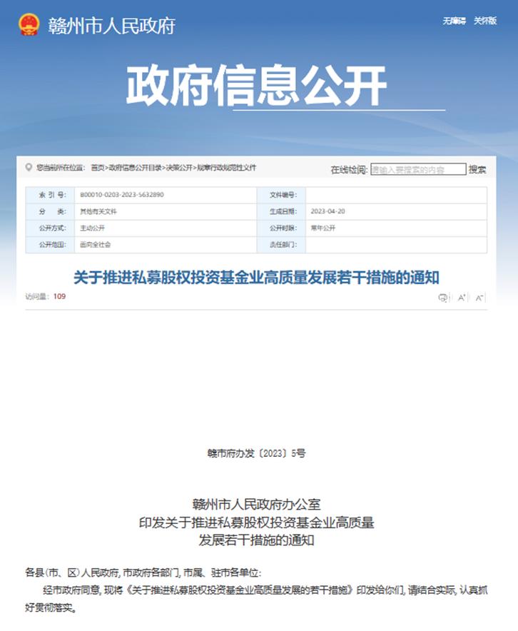 4月,赣州进一步发布了《关于推进私募股权投资基金业高质量发展若干措施的通知》,推动建立“链主+基金”招商模式。鼓励市、县政府产业引导基金与上市公司、产业链龙头企业合作设立基金,开展投行化、专业化招商,结合链主企业资金、信息和销售链优势及基金管理机构资本运营能力,引进补链强链延链的实体项目。