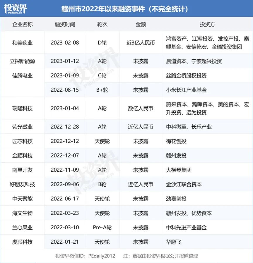 投资界-VC情报局根据公开消息不完全统计,赣州全市共发生融资事件123起,细分行业排名前三的分别是新材料、新能源、医药。