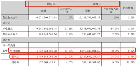 然而,正是公司的这两款主力型营收产品,却在2022年出现了增长停滞甚至于负增长的情况。2022年,公司吸油烟机增长-0.97%,燃气灶增长0.71%。