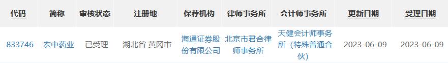 2022年11月,宏中药业进入北交所上市辅导期,之后公司于2023年5月30日通过辅导验收,并于6月3日向北交所报送了申报材料,6月9日获受理。