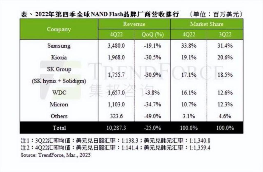 SK集团(SK海力士和Solidigm)也感受到了整体市场放缓的影响,报告显示第一季度企业级SSD收入为4.58亿美元,环比下降36.4%。