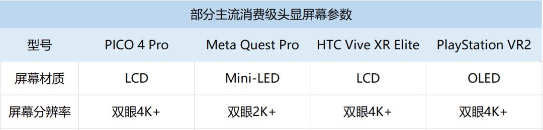 ▲部分主流消费级头显屏幕参数,来源:公开信息