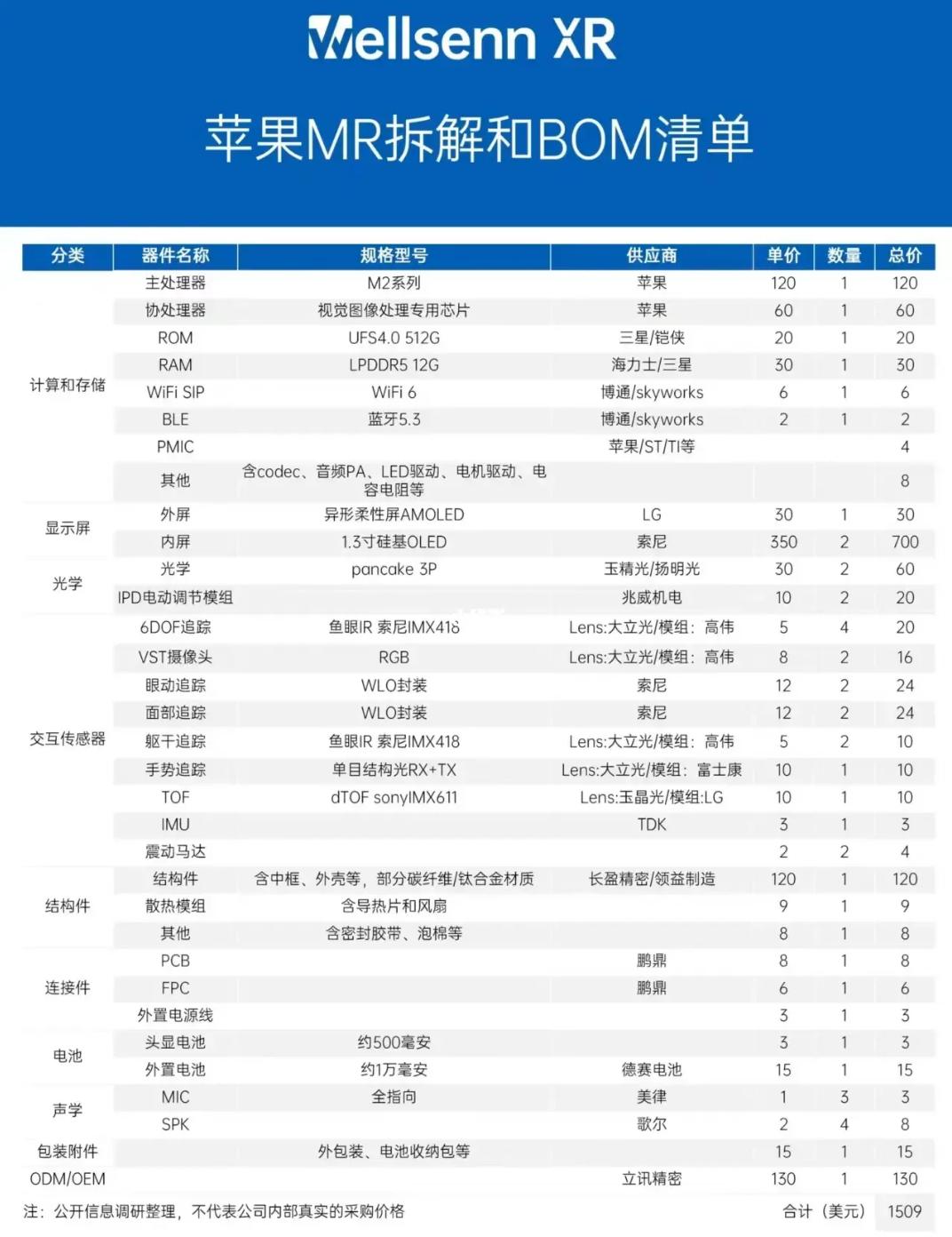 ▲苹果MR拆解和BOM清单,来源:Wellsenn XR