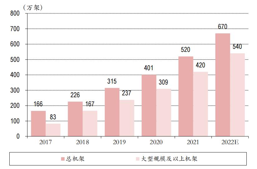 中国通信院数据显示,近年我国数据中心规模稳步增长,按照标准机架2.5KW来统计,2022年我国数据中心机架规模将达到670万架,近五年的CAGR超过30%。其中,大型以上数据中心增长更为迅速,2022年底规模达540万架,占比达81%。