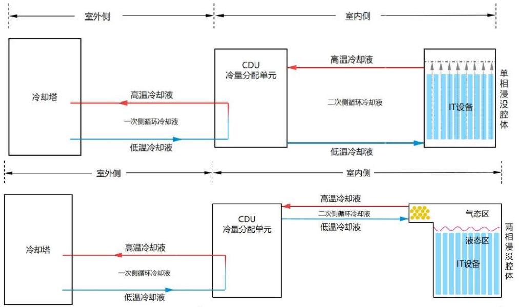 而浸没式液冷,则将 IT 设备发热元件全部浸没在冷却液中实现散热,根据工质是否产生相变又分为单相液冷和相变液冷。吸热后的冷却液采用风冷或水冷等方式循环冷却或者冷凝。