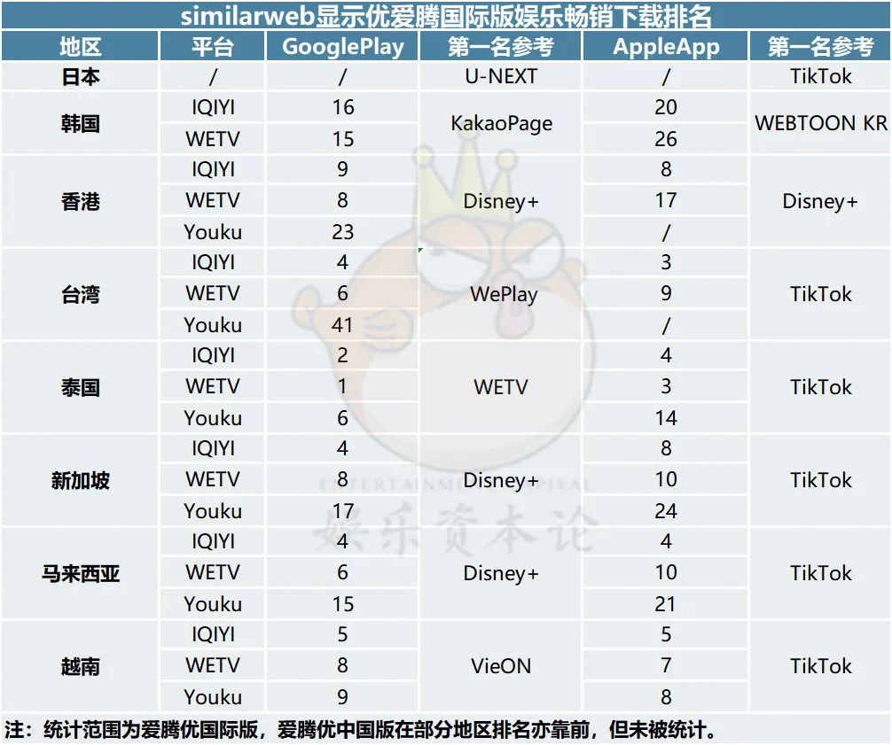 similarweb显示优爱腾国际版在不少东南亚地区国家的娱乐畅销下载排名靠前