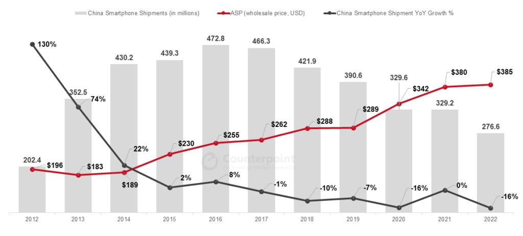 *中国智能手机出货量和批发均价趋势,2012-2022