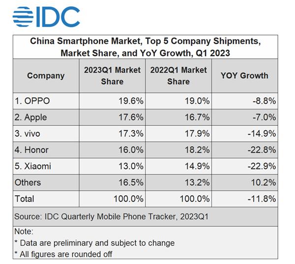 OPPO、苹果、vivo、荣耀、小米无一例外都遭遇了同比下滑。