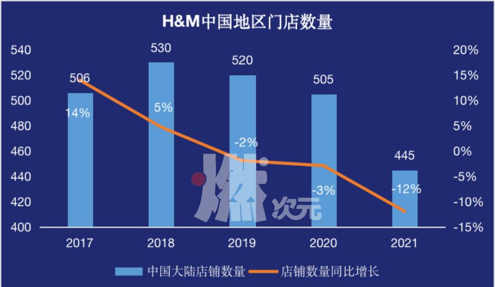H&M集团的财报也说明了其在国内关店的速度。财报显示,2019年开始,H&M在中国的门店数量就开始缩减,2019-2021年,H&M中国地区门店数量分别为520家、505家和445家,连续三年出现门店数量同比下降的情况,且下降比例不断扩大,从2019年的2%扩大至2021年的12%。