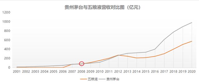 到2008年,茅台的出厂价才首次超过了五粮液。2013年之后,茅台的营收一路飙升,成了五粮液永远追不上的大哥: