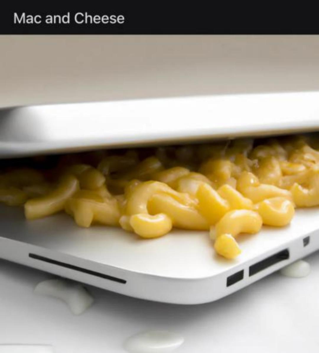(图注:此外,大模型对中文的支持度也不够,AI根据中文生成图像时,可能会照着中文的字面意思生成一些风马牛不相及的“怪东西”。对于英文的谐音梗,AIGC的理解也并不深入。例如OpenAI发布的人工智能图像生成器“刀姨”(Dall-E2)把通心粉(Macaroni)的俗称“mac“理解成了苹果电脑“Mac“,画出了这幅苹果笔记本烤芝士烤通心粉。)