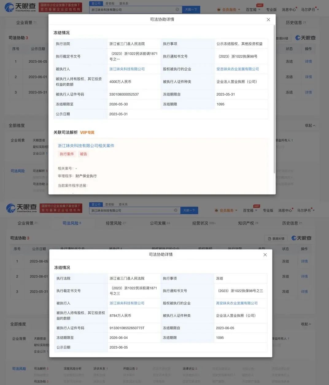 近日,网易味央关联公司浙江味央科技有限公司新增2则股权冻结信息,股权被执行企业包括安吉味央农业发展有限公司、高安味央农业发展有限公司,冻结股权金额分别为4000万元、8784万元。这两家企业是浙江味央的核心企业,是网易黑猪的主要养殖场。